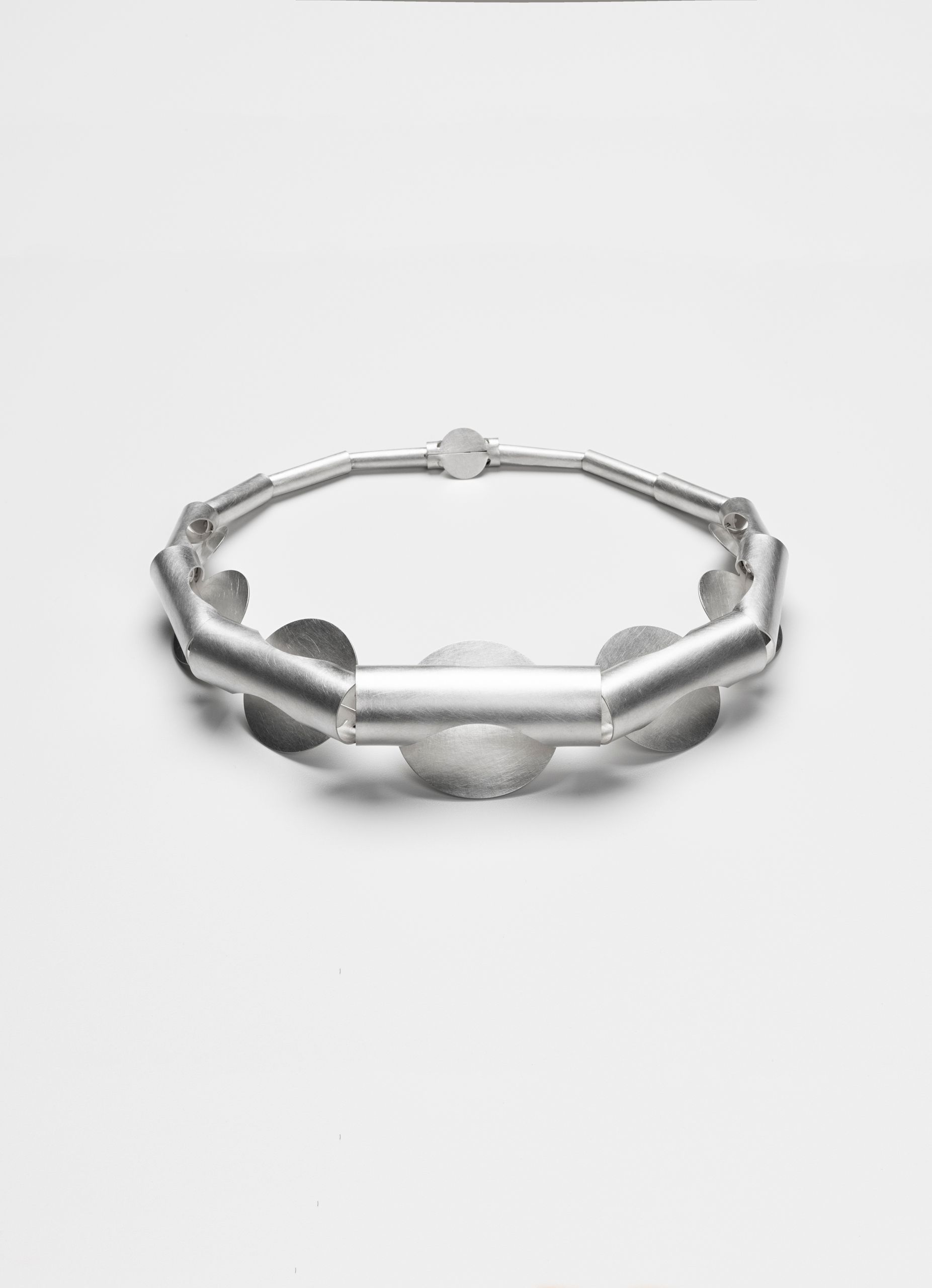 Chaque module est présenté seul en boucles d’oreilles ou en bague, afin de souligner son volume pur, franc et affirmé. J’ai ensuite choisi d’utiliser la répétition des modules pour créer un rythme. Ainsi, un dialogue entre le plein et le vide se crée et nous invite à explorer ces espaces ouverts ou fermés. Pour assembler les divers modules, j’ai élaboré des systèmes de liaisons et des fermoirs propres à chaque module, ce qui ajoute un caractère unique au bijou final. La déclinaison des modules répétés forme des colliers audacieux qui apportent une réelle présence.