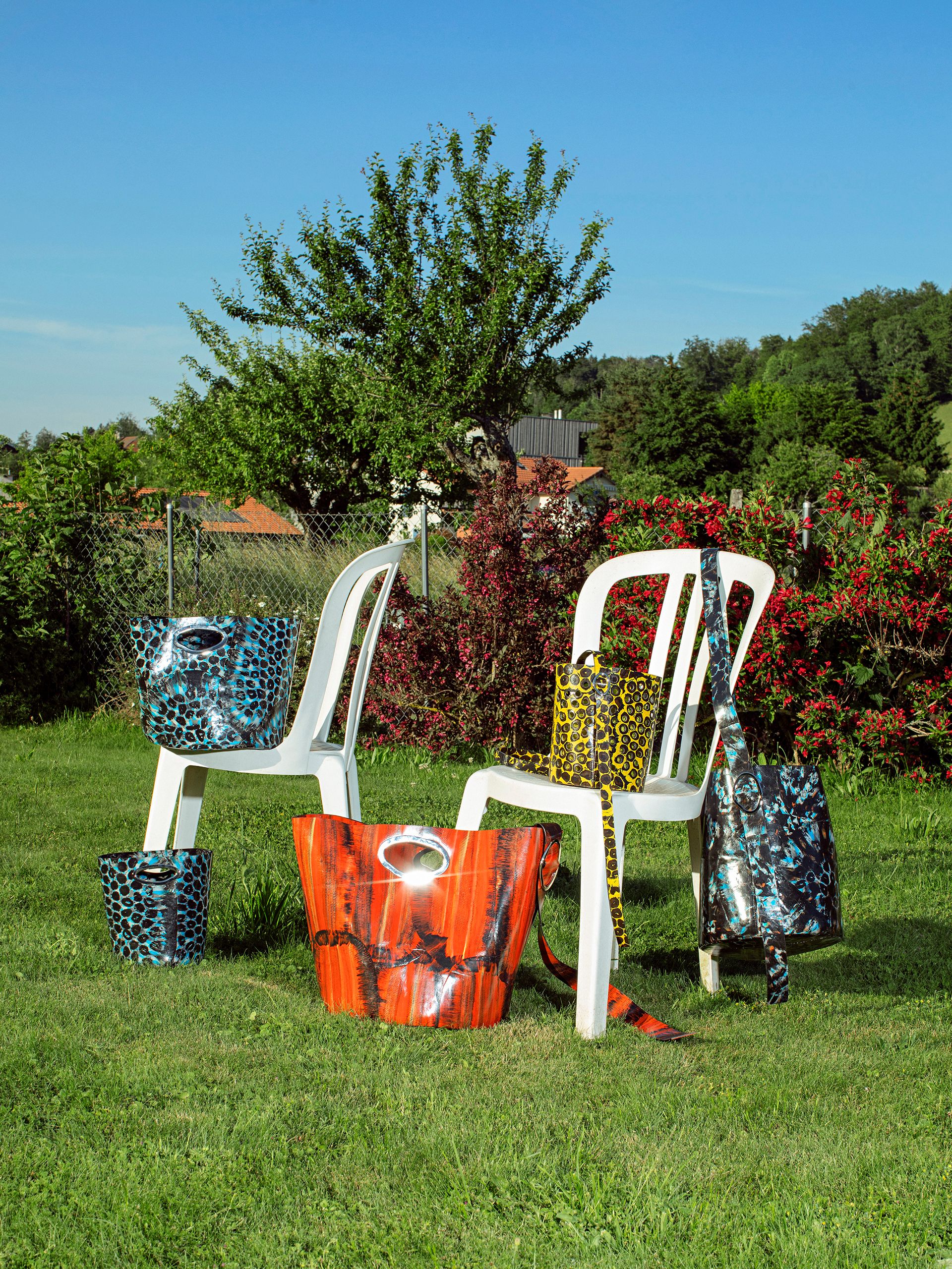 le manteau de pluie se transforme en un nuage de mohair turquoise et bleu ciel qui dessine un horizon naturel. Suivi par le gilet du pêcheur en mailles imperméables aux nuances rouille comme la bassine à grenouilles.